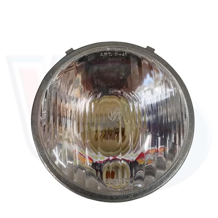 VE26014 BOSATTA HEADLAMP - PLASTIC TYPE - ROUND 105mm - VESPA 50-90-100. High quality lamps and lenses manufactured in Italy by Bosatta, since 1958 Bosatta has specialised in the production of lighting and electrical components for motorcycles and scooters. Please Note - Do not use with Halogen Bulbs. This headlamp is only suitable for use with standard type bulbs, the use of a halogen bulb may damage this lamp. This Bosatta headlamp is supplied with a bulbholder. The measurement 105mm refers to the visable size of the glass, the overall size will measure larger.