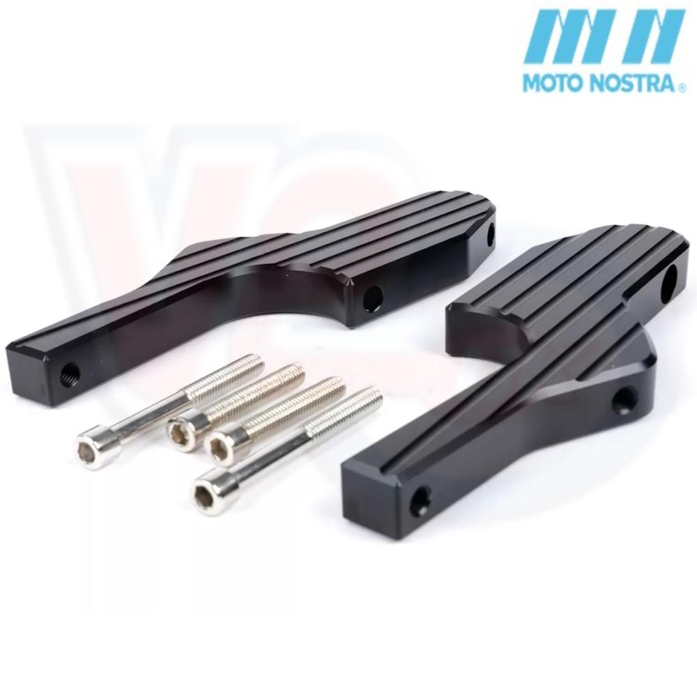 VE60371-BK MOTO NOSTRA FOOTPEG EXTENSION - BLACK ANODISED - VESPA GT-GTS. Piaggio has chosen the position of the passenger footrests on their GT/GTS/GTV models somewhat unfortunate. In the rarest of cases, the feet can be set down comfortably. For smaller pillion riders they are difficult to reach, larger ones usually bump into the rider's legs with their shoes. The CNC machined Moto Nostra aluminum adapters position the original footrests where they belong. The seat ergonomics are greatly improved, even long tours to enjoy. The noble anodized surface protects the aluminum and offers a fine look, they are machined flat on one side and grooved on the other side, giving users the choice of looks.The assembly is very simple and quickly done. All parts needed for mounting are included. Cross reference Moto Nostra MN1061S. PLEASE NOTE: The adapters are compatible with the following side rear crash bars: FA ITALIA VE60284, PIAGGIO 602960M. I.