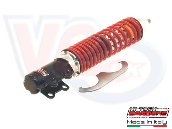 VE60365 CARBONE RED/BLACK FRONT DAMPER (SHOCK ABSORBER) with PRE-LOAD ADJUSTMENT - VESPA GT/GTS with 35mm SPACING 2 BOLT LOWER MOUNTING - DOES NOT FIT 2014-16 MODELS WITH SINGLE LOWER BOLT, and from 2022 on can only be used on KEYLESS MODELS WITH HENG TONG CALIPER. MADE in ITALY, TECNICAL INFORMATIONS: HYDRAULIC - DOUBLE EFFECT (BRAKED IN COMPRESSION AND EXTENSION) STRUCTURE STEEL WITH INDUCTION WELDS - SPRING: TEMPERATED STEEL - 3 POSITIONS ADJUSTMENT - BLACK BODY - RED SPRING.