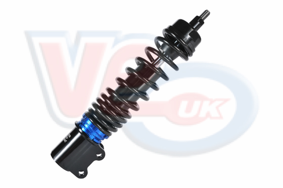 VE60301 FORSA ALLOY CNC MACHINED BLACK FRONT DAMPER (SHOCK ABSORBER) with BLUE ANODISED PRE-LOAD ADJUSTER - VESPA GT/GTS with 35mm SPACING 2 BOLT LOWER MOUNTING - DOES NOT FIT 2014-16 MODELS WITH SINGLE LOWER BOLT, and from 2022 on can only be used on KEYLESS MODELS WITH HENG TONG CALIPER.