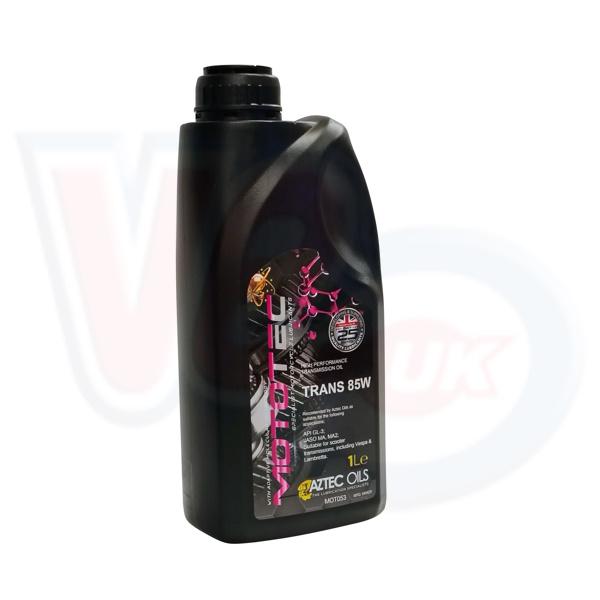 AZ10002 AZTEC MOTOTEC TRANS 85 - SAE 85 OIL - 1 LITRE. .A modern alternative for Lambretta gearboxes, a high performance semi synthetic motorcycle and scooter transmission oil formulated using an advanced blend of base oils which have been carefully combined with specialised additive technology. Provides outstanding wear protection to transmission components under high loads and high engine speeds. Sophisticated friction modifiers enable a superb wet clutch response for smoother gear shifts and fast acceleration throughout the drain interval. Benefits Exceptional anti-wear properties. Excellent oxidation & thermal stability. Good shear stability prevents viscosity break down. Shown to improve clutch life & reduce slippage. Provides protection to the transmission & wet clutches under the most demanding conditions.