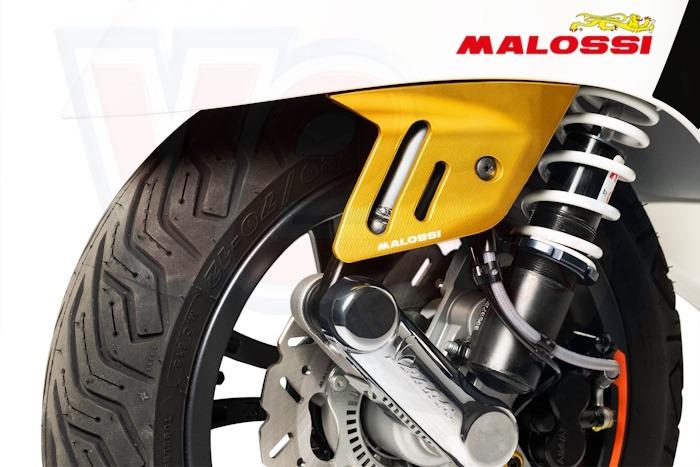 VM8120498BD MALOSSI CNC ALUMINIUM FORK LEG COVER - GOLD - fits VESPA GTS MODELS 2023 on. MALOSSI FRONT MUDGUARD FIN, The Vespa's front mudguard gains a new profile with the Malossi fin. This CNC-machined anodised aluminium accessory, featuring contoured slots and the Malossi logo, attaches to the original structure via two upper mounts, adding a touch of character and sportiness to the front suspension. Install with care, as the anodised finish is more delicate than other finishes. It is easy to clean, but avoid alkaline products to keep it looking like new. Available in black, red and gold.