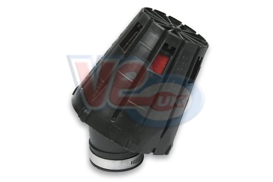 VM043296-C MALOSSI 38mm E5 ANGLED AIR FILTER & COVER - DELLORTO PHBL. .E5 air filter with filtering component made of red expanded polyurethane for 50 cc scooters. E5 is available in a range of sizes that fit any CARBURETTOR from à 12 to à 30. Shape: sleek, aerodynamic and compact. Construction: Web structure, lightweight and removable. Filtering component made of expanded polyurethane with open cells, self extinguishing and with a big accumulation pipes and surfaces have been expressly calculated. E5 is pre-eminently an air-horn filter therefore it has two special qualities: the one of air intake (Venturi) and the one of air filter. .Cross reference Malossi 04 3296.C0.