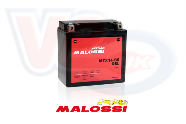 VM4418923 MALOSSI GEL BATTERY MTX14-BS (YTX14-BS). MEASURES LENGTH 150mm - Width 87mm - HEIGHT 145mm. TECHNICAL FEATURES Ready to use & Maintenance free - Factory activated (VRLA) - Non spillable - Multi-positional fitment (can be tilted up to 90 degrees) - Minimized plate sulfation - Suitable for cold weather - No acid handling - Increased lifetime - Compliant with 2021 European Regulation - Voltage 12. APPLICATIONS - Motorcycle - Scooter - ATV/SSV - UTV - Watercraft - Snowmobile.
