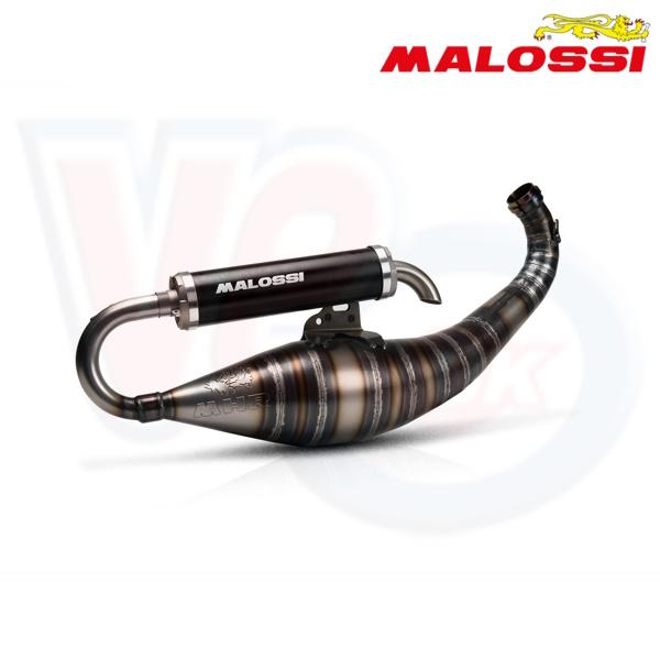 VM329999 MALOSSI MHR RACE EXHAUST - MALOSSI MHR 100cc - PIAGGIO ZIP SP (only for use with MHR 100cc Cylinder VM318679). . The Malossi Scooter Racing MHR exhausts have been conceived and manufactured with a single objective: to achieve the highest possible performance when paired with the 100 cc cylinder for which they were designed. All Scooter Racing exhausts are crafted from steel sheets with an exact and constant thickness of 0.8mm, laser-cut, and assembled with meticulous precision using robotic T.I.G. and M.I.G. welding along with manual oxyacetylene welding, and finally hand-hammered for optimal finish. They also feature a calibrated nozzle, engineered to strict tolerances to ensure that the pressure inside the exhaust remains within the correct parameters. Each exhaust is coated with a clear coat finish and comes equipped with an aluminum silencer, anodized in black and featuring the Malossi logo. Scooter racing MHR exhaust: born to win. .The cylinder attachment system includes threehole lightweight alloy connector, designed to allow the perfect flow of exhaust gases, thus optimizing their dynamics. The connection system for the black anodized aluminum silencer has also been simplified it is now elegantly and lightly attached to the exhaust expansion with a single fastening screw. Cross reference Malossi 3219999.
