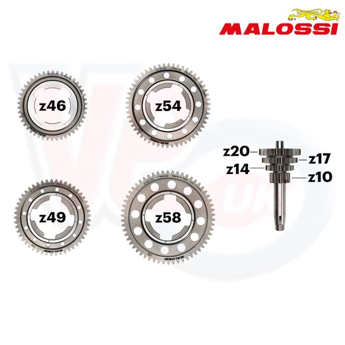 VM670145 MALOSSI SPORT GEARBOX - 4 GEARS & GEAR CLUSTER - SMALL FRAME VESPA. The Vespaâs fixed wheelbase makes final-drive changes difficult, so Malossi developed a complete Small Frame gear cluster and gear set with revised ratios for better performance. Available in Sport (VM670145) for torque-focused engines and Racing (VM670146) for track setups, both versions use identical tooth counts on the 4 loose gears but different gear clusters to optimise transmission behaviour. All components are CNC-machined, case-hardened at 900°C, and finally inspected on Zeiss equipment 3 dimensional inspection machines. The gearwheels feature materials that exceed the rigorous Malossi standards and are subjected to a thermo-chemical hardening treatment, then the surfaces are precision-ground, they also feature oil-retention pockets, weight-reduction holes without compromising strength. Sport ratios: Z10-58, Z14-54, Z17-49, Z20-46. Racing ratios: Z10-58, Z15-54, Z18-49, Z20-46. This is the Sport gearbox, Z10-58, Z14-54, Z17-49, Z20-46, this gearbox should be used with a late type 50.2mm 4 speed gear selector. Special order part, allow 5-7 days for delivery. Cross reference Malossi 6720145.