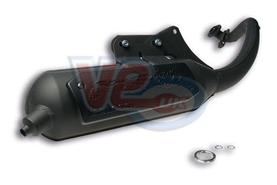 The Malossi Wild Lion exhaust for 50cc scooters, a quality low cost exhaust, that is ideal for a standard replacement, still nice and quiet, yet can give a nice improvement in performance if desired, finished in heat resistant black epoxy and with the heat shield carrying the Malossi lion logo.