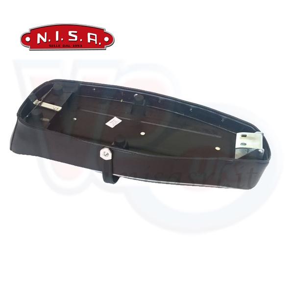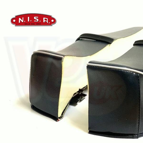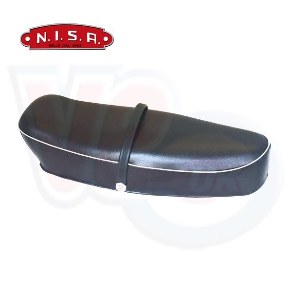 VE40104-C NISA COMFORT DUAL SEAT with MODERN SPONGE BASE - BLACK - SMALL FRAME VESPA. .Standard seats have a sprung base, and this is where these comfort seats differ, these have a modern foam seat base making them much more comfortable, made in Italy by Nisa, they have combined the looks of a standard seat with the modern production methods of seat construction to make a more comfortable standard seat.