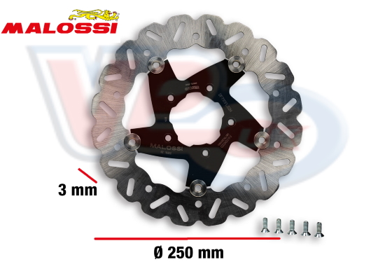 The Newest Generation of Disk Brakes. Light, non corrosive, non-warping, antistress. Studied for prolonged use in all weather conditions and types of terrain. The WHOOP DISCS were exposed to numerous tests during competitions, giving Malossi technicians an opportunity to fine-tune the disk brakes for various vehicles. The WHOOP DISC paired with Malossi BRAKE PADS guarantee a progressive and secure braking even under extreme conditions. Technical features Stainless steel disk, laser cut, hardened and surface machined. Profile designed using CAD to insure complete scraping of the brake pad, the elimination of brake dust, and the removal of water and mud during braking. Surface area doubled to lower the disk s working temperature.Malossi number 6217456 250mm OD, 3mm Thick