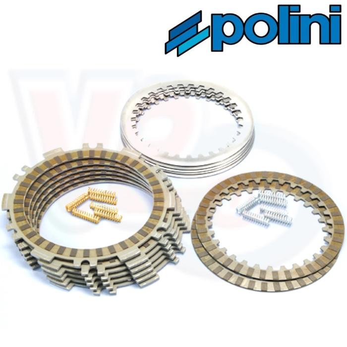 VP2300020 POLINI CLUTCH PLATE SET - KYMCO AK550, YAMAHA T-MAX 530-560. .With this new clutch kit Polini wants to satisfy all users of both the Tmax 530 and 560, eager to have a clutch always at the peak of its efficiency on any type of track with a handsome, reliable and safe set-up. The clutch consists of discs equipped with a metal support and a coating made of friction material which has been formulated after extensive testing to better suit the characteristics of the TMax scooter. It consists of a mixture of new fibers that can transmit all of the power of the engine whilst bearing the highest working temperatures without ever seeing a loss. To give even more grip to your scooter the kit is supplied with two different sets of clutch compression springs with two different loads easily recognisable by their colors: white zinc plated and yellow zinc plated. It's a kit designed to improve and optimize the performance of the clutch coupling and increase the rpm over the original unit before the clutch engages. White zinc plated springs: clutch coupling 3000 rpm, clutch slippage 5500 RPM. Yellow zinc plated springs: clutch coupling 3200 rpm, clutch slippage 5500 RPM. The Polini clutch kit ensures a better power output at every speed, burning startswithout penalising the modulation of the clutch. These improvements provides aconstant optimisation of the transmission even when the clutch has undergone a long and arduous workout with the maximum of stress placed upon it. Cross reference Polini 230.0020.
