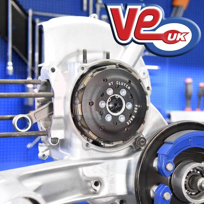 VP300535 POLINI HIGH TORQUE CLUTCH FOR RACE with WAVE SPRING 23T HELICAL GEAR - fits VESPA PX with 65T HELICAL (2.82 to 1 Standard P200 RATIO). .Polini High Torque Clutch for Race is the top tier of Vespa clutch engineering, developed directly from endurance competition where smooth engagement and absolute reliability are non-negotiable. Its reversed-layout design transforms the feel of the PX, Cosa, PE and T5 platforms, giving you precise, effortless gear changes even under heavy load. The heart of the system is a Polini adjustable wave spring, allowing you to fine-tune clutch tension using spacers for the exact bite you want. The basket is machined from a special aluminium alloy for strength without excess weight, while the aluminium clutch plates use eight tabs and an increased friction surface to deliver serious grip with excellent heat stability. A pressure plate running on an axial bearing keeps operation smooth and consistent, even during long, hard rides. This version comes with a 23-tooth helical gear designed to pair with the 65-tooth primary for a 2.82:1 ratio (75mph at 7000rpm), making it ideal for tuned touring engines and high-torque builds that need clean, predictable power delivery. Polini also includes a special clutch nut, and an extended clutch breather to accommodate the increased oil capacity — the system runs with 500 ml of gearbox oil for improved cooling and longevity. The result is a clutch that feels light and refined on the lever, brutally strong under power, and perfectly suited to modern performance engines while keeping the unmistakable Vespa character intact. Cross reference Polini 230.0535.