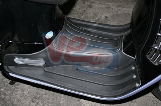VE60091-BK RUBBER FLOORMAT - BLACK - VESPA GT - VESPA GTS. The painted floor on a scooter is easy to damage, although the standard rubber strips will keep most of it protected in normal use, scratches and chips on the painted surface between them can occur, protect it with a rubber mat that is taylor made for each model.