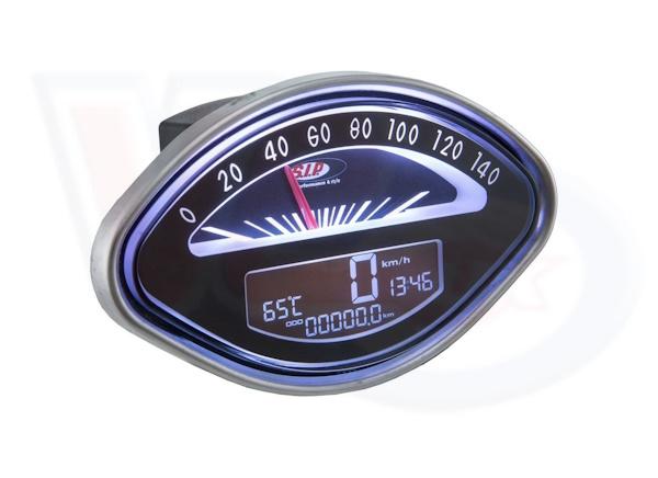 VE22086-BK SIP BLACK 2.0 SPEEDO-REV COUNTER - VESPA GT125-GL150-GS150-VBB150-GS160-180SS. .The functions of the SIP Rev counter/Speedometer 2.0: Analogue rev counter up to 12 or 14000 rpm, according to model. Digitally rev counter: rpm up to 14000 rpm. Maximum rpm. As an alternative to an analogue rev counter, the speedometer needle can also display maximum speeds of up 140 kph/mph. Digitally displayed speed: 199 kph or 140 mph Maximum speed.Temperature: 250C or 32-482F for cylinder head or cooling water temperature, a temperature sensor for the spark plug is also included in the delivery. Time. Maximum total measurable distance travelled: 99999 km or miles. Adjustable total journey distance. 'A' and 'B' stage distance extended to 9999,9 km or miles. 'A' and 'B' stage time 99,59 h. Average 'A' and 'B' stage speed 199 kph or 140 mph. Five back-light brightness setting. Fuel reserve warning.(optional with VE13092-W OMG Fast Flow fuel tap with level indicator). .Cross reference Sip 50000730.