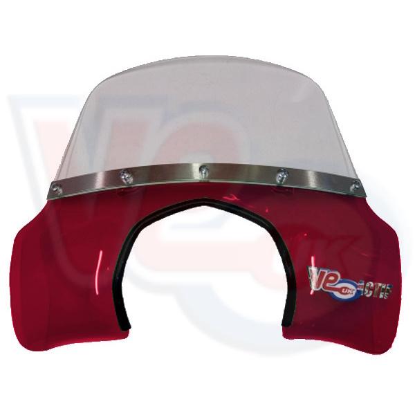 LE17023-R VE ACTIF MOD FLYSCREEN with FITTINGS - TRANSPARENT RED - LAMBRETTA SX-TV. .VE Actif Mod Flyscreens are all made in Britain by our own in house staff that meticulously make and assemble each screen by hand, the classic Mod Flyscreen design has remained unchanged since its first creation in the 1960's. This flyscreen fits headests with the 7 sided headlamp rim as fitted to SX, TV and Li Special series 3 models (the Li models with the SX headset). VE Actif Mod Flyscreens are supplied with a Standard shape clear top blade, however we can now offer the top blade in a choice of 2 shapes standard or rounded and 4 colours Black tinted, Blue tinted, Bronze tinted or Clear, please note your selection at the time of ordering (in the order notes field) or the standard screen with a standard clear blade will be supplied. Blades are also available separately, look up part number VE17231 to see the range. Please note that at custom selection may add a few days to the order time.