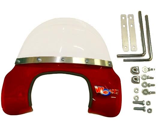 RA17002-R VE ACTIF MOD FLYSCREEN - TRANSPARENT RED - ROYAL ALLOY GP-GT with RECTANGULAR HEADLIGHT - SCOMADI TL (TURISMA LEGGERA). VE Actif Mod Flyscreens are all made in Britain by our own in house staff that meticulously make and assemble each screen by hand, the classic Mod Flyscreen design has remained unchanged since its first creation in the 1960's. Flyscreens are supplied with a fitting kit. These VE Actif Mod Flyscreens are supplied with a Rounded shape clear top blade, however we can now offer the top blade in a choice of 2 shapes rounded or standard squared top and 4 colours Black tinted, Blue tinted, Bronze tinted or Clear, please note your selection at the time of ordering (in the order notes field) or the screen will be supplied with the rounded clear blade. Blades are also available separately, look up part number VE17231 to see the range. Please note that a custom selection may add a few days to the order time. Fitment ROYAL ALLOY 125 4t - GP 125 i AC ROYAL ALLOY 125 4t - GP 125 S LC ROYAL ALLOY 124 4T - GT 125 i AC ROYAL ALLOY 200 4T - GP 200 i LC ROYAL ALLOY 200 4T - GT 200 i LC ROYAL ALLOY 300 4T - GP 300 S LC SCOMADI TURISMO LEGGERA 50 4T SCOMADI TURISMO LEGGERA 125 4T SCOMADI TURISMO LEGGERA 200 4V LC SCOMADI TURISMO LEGGERA 300 4T